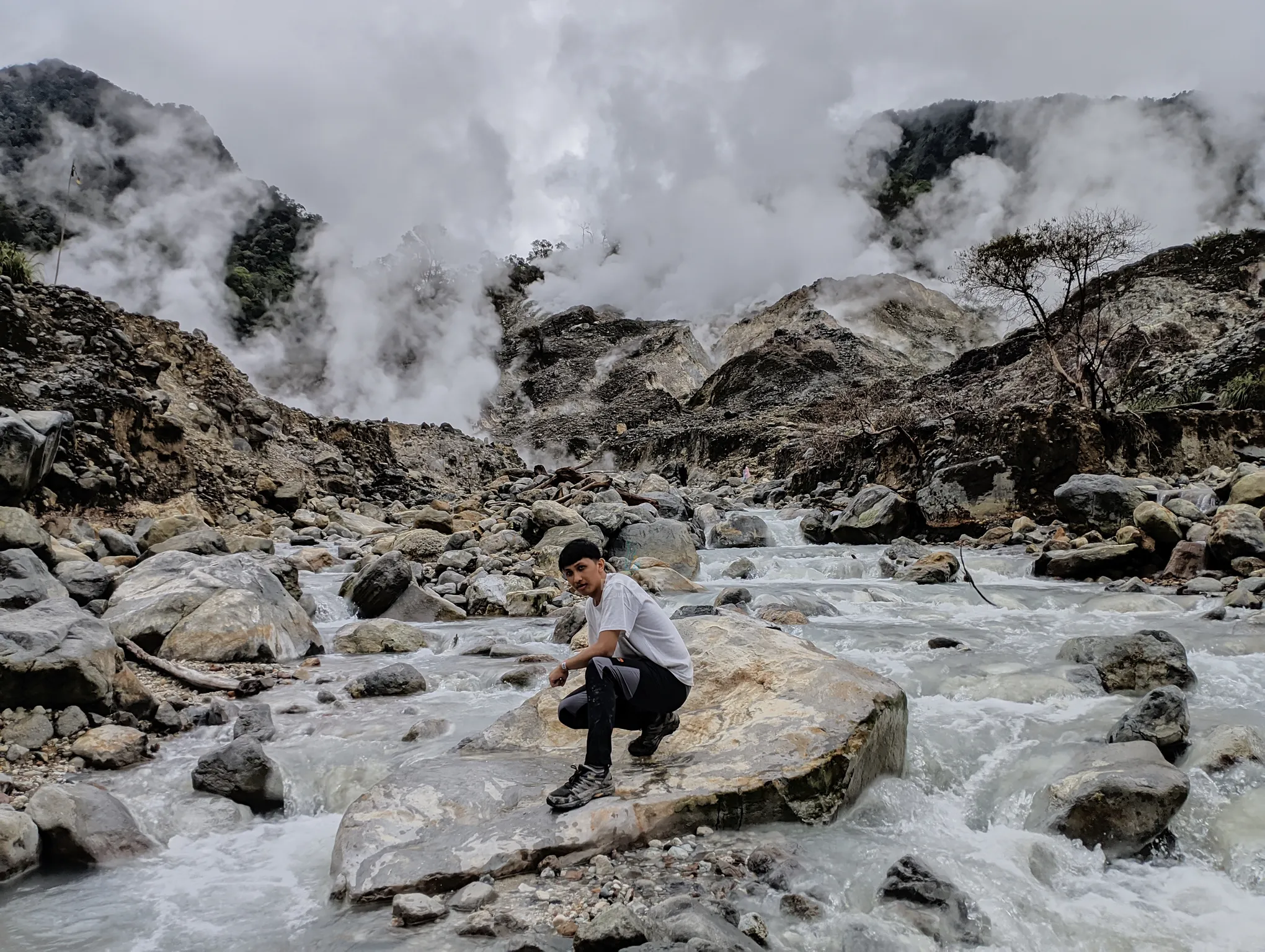 - Spot foto aesthetic di antara batang pohon mati sekitar kawah.